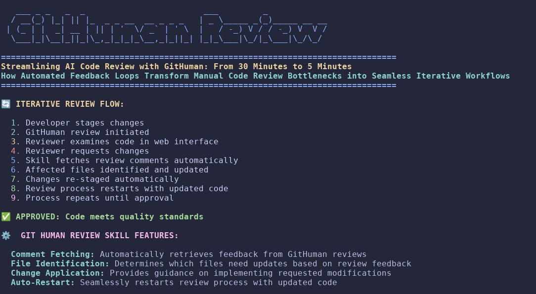 Implementing the GitHuman review process for AI-generated code dramatically reduces the time needed to conduct thorough code reviews, transforming a potentially 30-minute manual task into a 5-minute automated process that fits perfectly into a side project developer’s busy schedule.